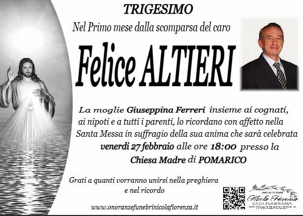I familiari ringraziano anticipatamente tutti coloro che parteciperanno alla cerimonia funebre e tutti coloro che scriveranno con affetto un Pensiero di Ricordo.